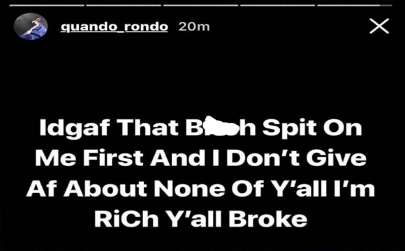 X Quando Rondo stirred controversy Friday night in Florence, SC after footage surfaced showing him spitting on a fan. Quando took to his IG Story to issue a response to the incident. He wrote, “Idgaf That B—-…